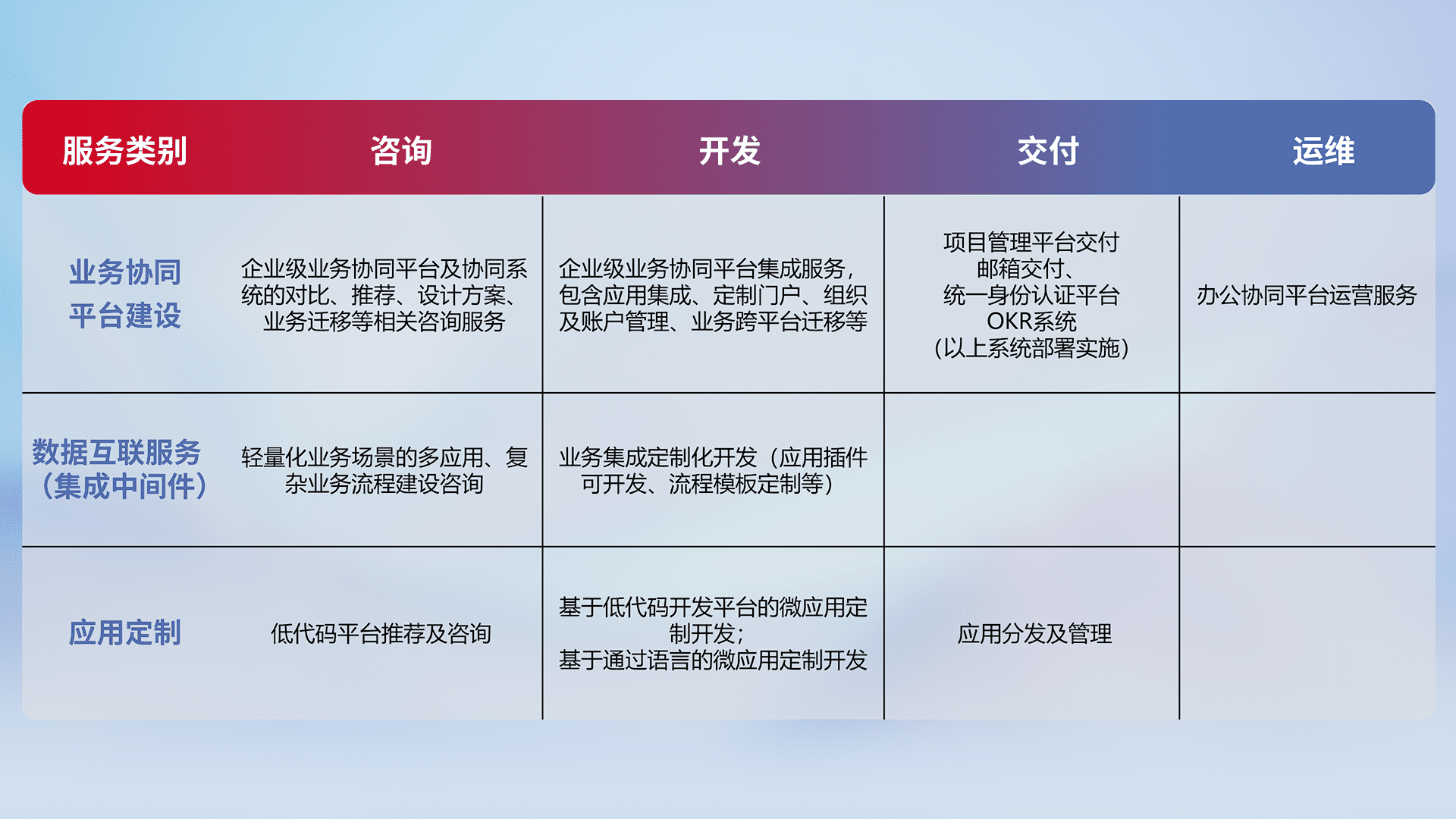 针对钉钉、、、、企微、、、IDaas等平台级产品提供产品的规划、、、、方案、、、、交付、、定制化开发等服务,,,,实现如统一协同办公、、、、智能客户服务、、、、混合会议管理、、智能数据查询、、、等业务场景,,,实现数字化转型。。